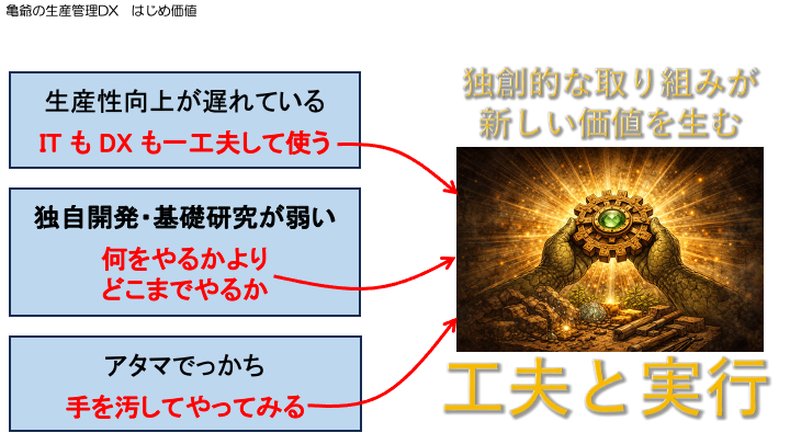 製品を買って来るだけでは、付加価値は生まれない。既存の技術でも工夫して使う事が重要だ。借り物でない取り組みが、新しい価値を創り出すと信じる。