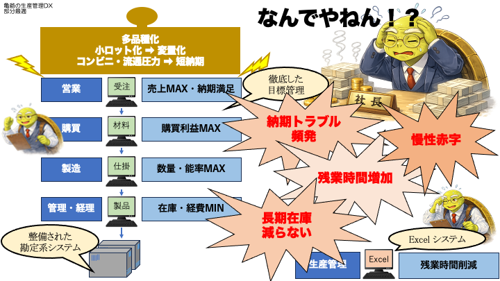 一方で、ニーズの多様化とコンビニの台頭で、多品種・小ロット・短納期化が一段と進み、生産管理の事務負荷は増大して管理キャパ超えによる人的ミスが頻発。これに振り回される製造現場は疲弊し、管理崩壊ギリギリのところまで来ていた。