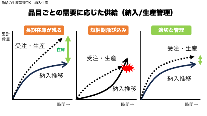 この様に、納期情報の精度が低いと、長期在庫が残ったり、短納期になったりするため、営業部門による不断の需要把握と、正確な情報発信が重要になります。